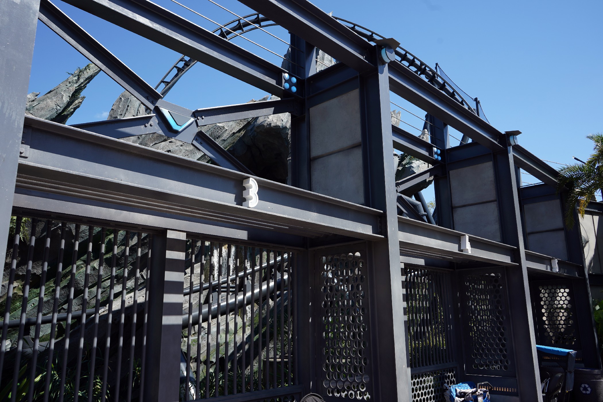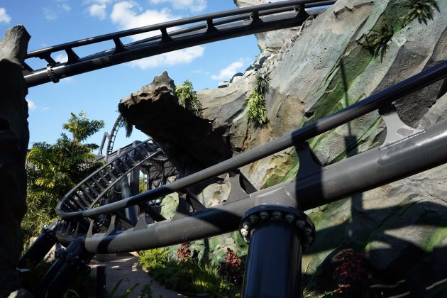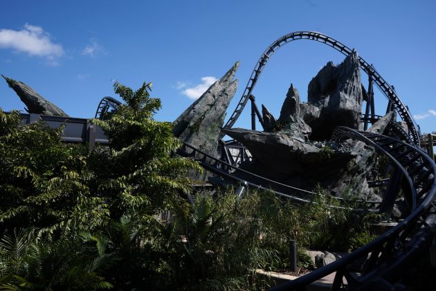 Construction walls have been removed near the “paddock area” of the Jurassic World VelociCoaster, giving us our first glimpses of all the twists and turns, foliage, and the launch section of the track.