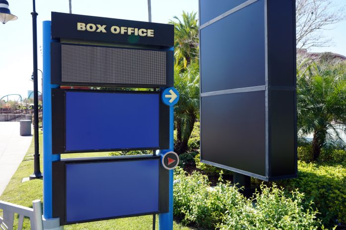 The massive sign marquee on the Sound Stage has been painted over with blue paint, with the box office signage and the illuminated banners that lined the walkway now blacked out.