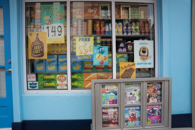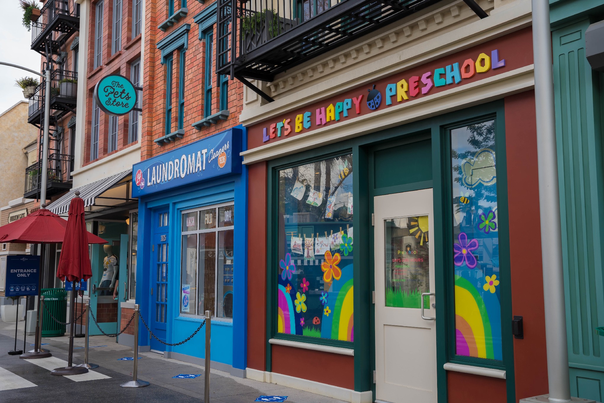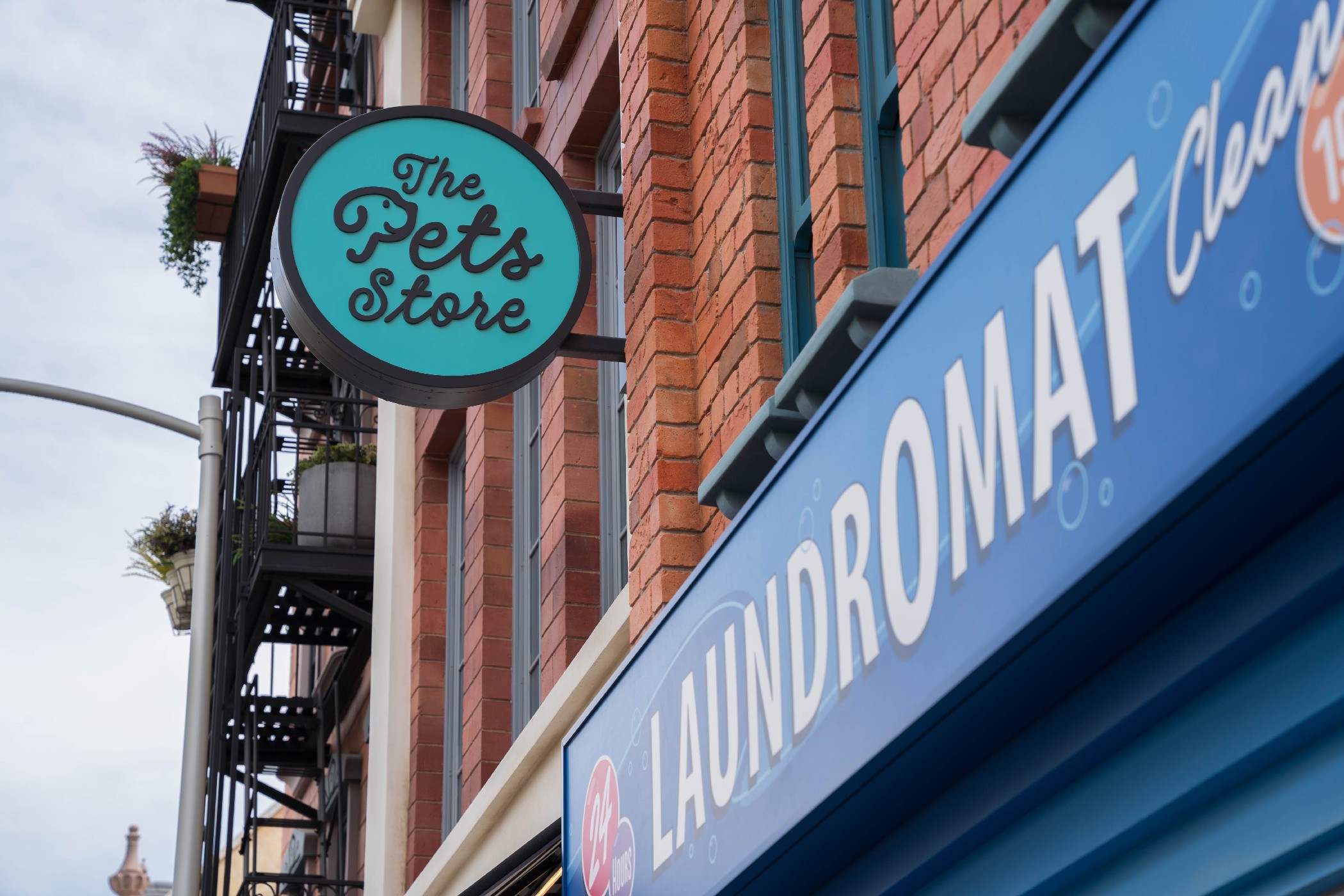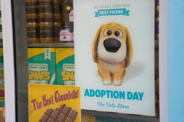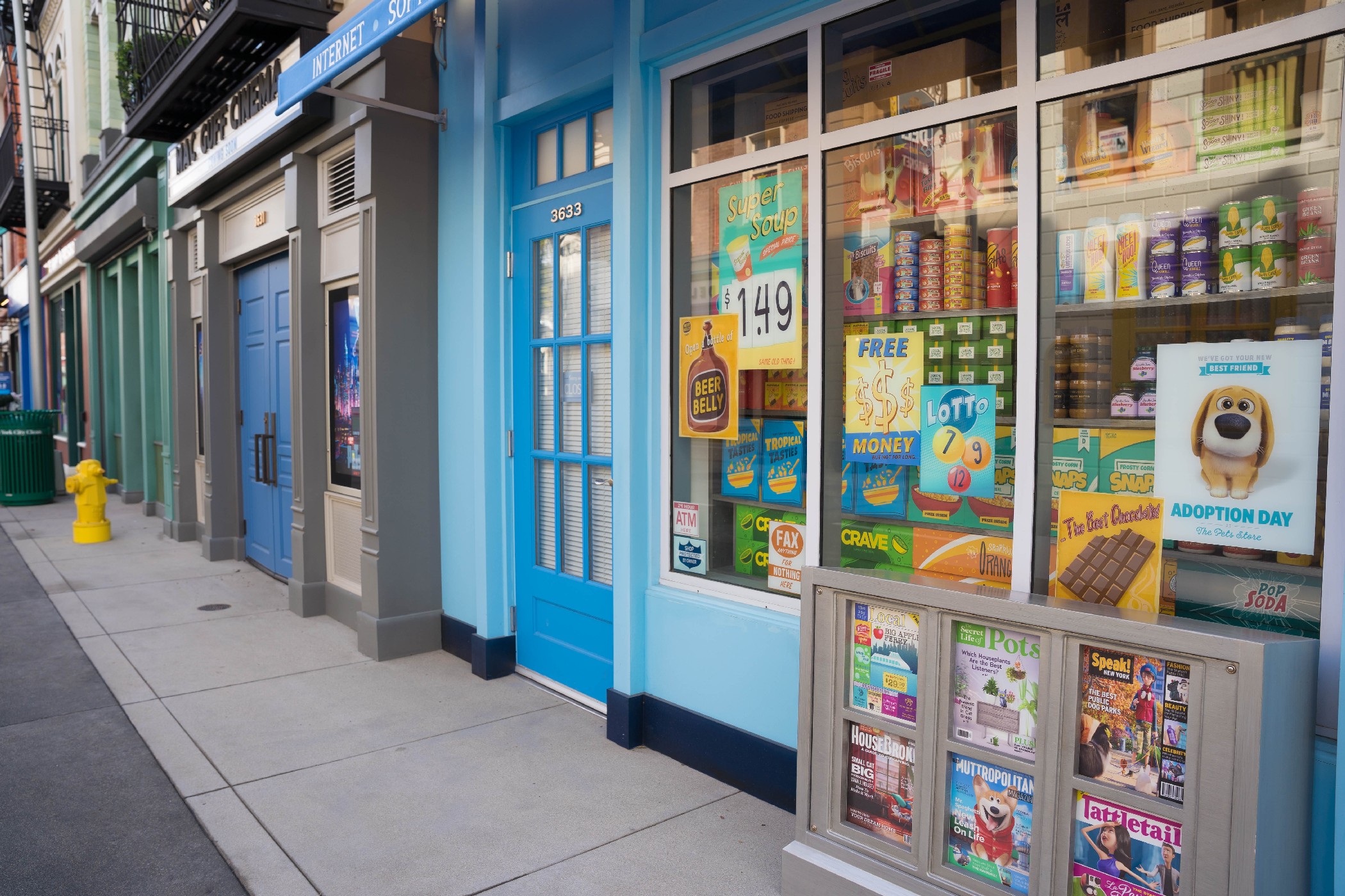Most other storefronts lining both sides of the street are purely decorative, though certainly add to Pets Place with their many fine details. Magazine covers and advertisements based on the films can be found in the land’s grocery store exterior, including one for The Pets Store itself. Children’s drawings hang on a clothesline above cubbies filled with lunchboxes in the preschool, with Max himself making an appearance in the centermost picture. A laundromat, movie theater, bookstore, newspaper stand, and subway station (where guests will pick up their virtual line tickets) can also be found on the left side of the street along the show building for the ride when one is facing Despicable Me: Minion Mayhem. Up above in the apartment windows are an assortment of regular household items, including lamps, animal-themed board games, and other subtle touches that add life to the street.