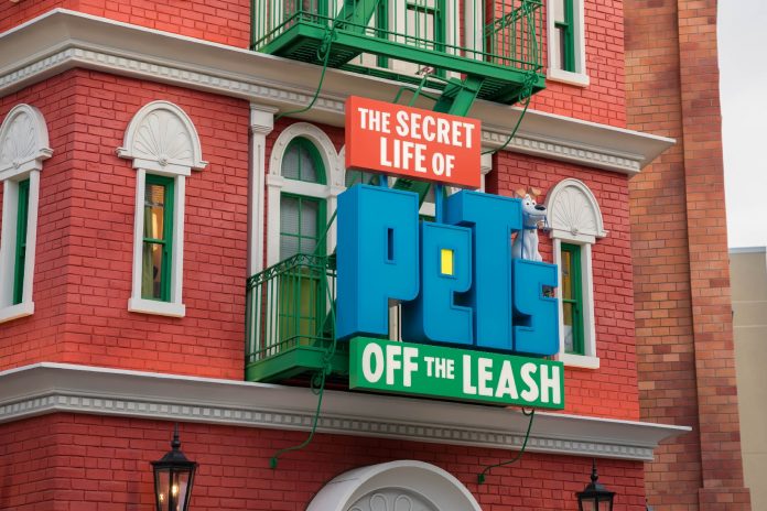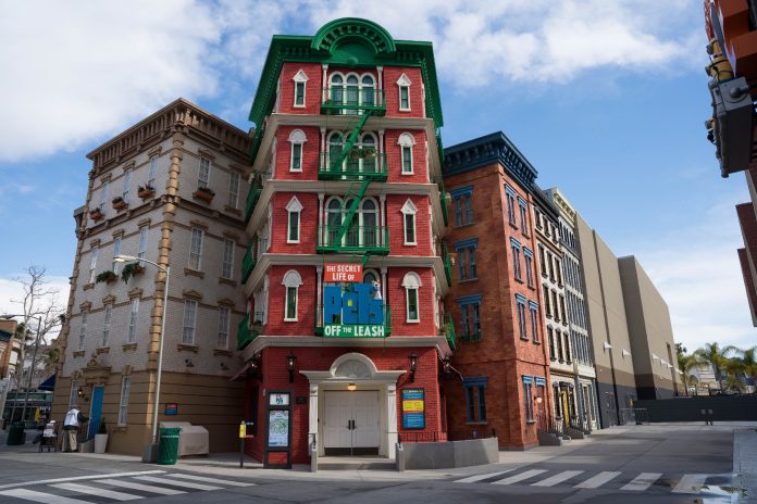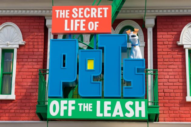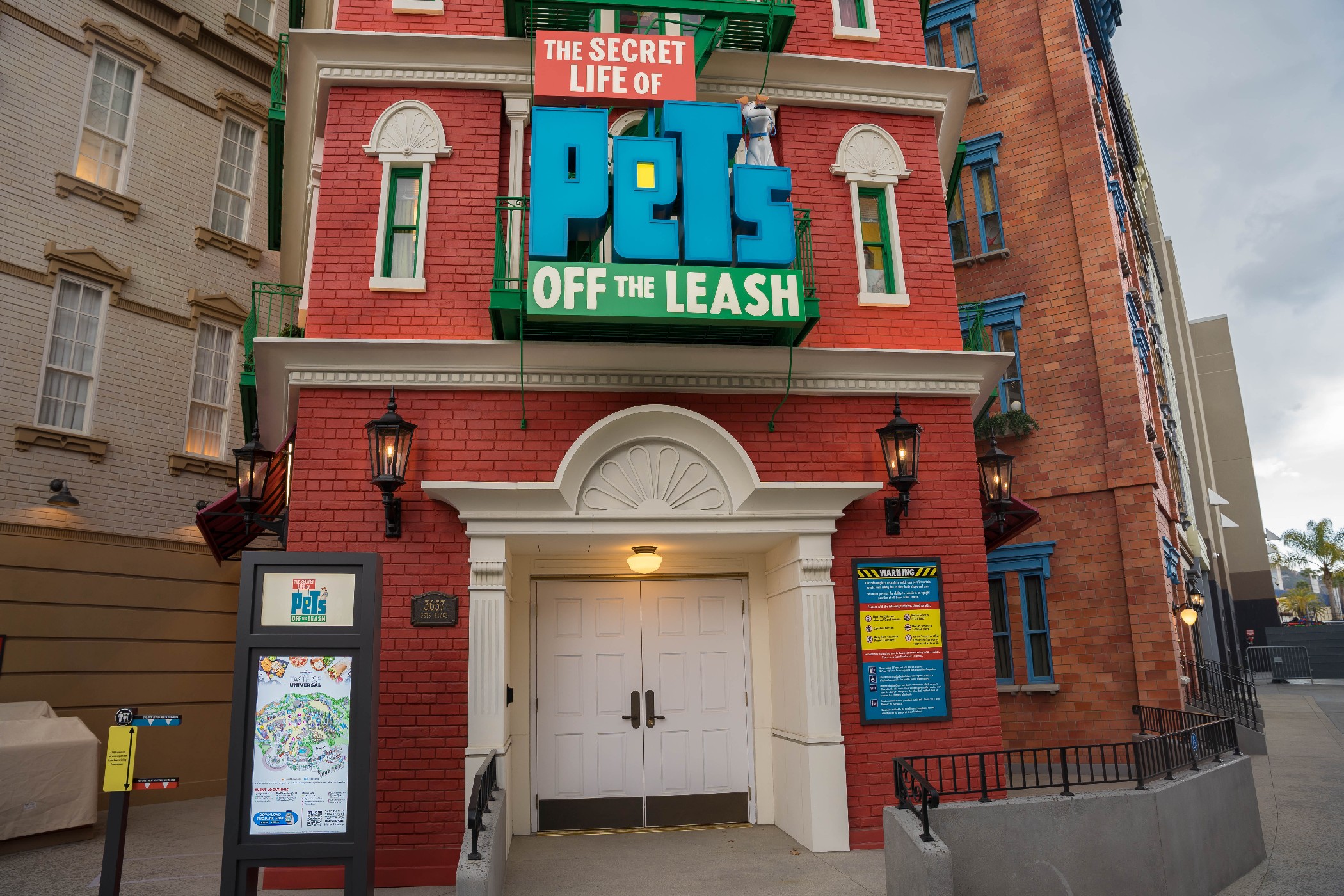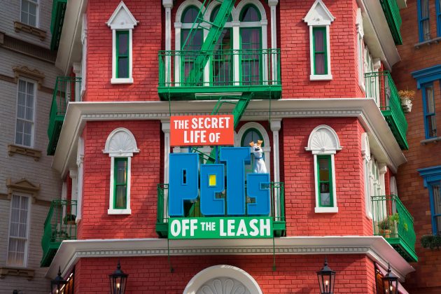 With the opening of Universal Studios Hollywood’s Taste of Universal event came the reveal of the now-completed Pets Place area. Taking the place of Baker Street in the park, Pets Place brings to life the cartoonish, vibrant New York City from The Secret Life of Pets films with colorful storefronts and detailed apartment windows all leading up to the entrance of The Secret Life of Pets: Off the Leash! ride, with its exterior themed to look like the main apartment building from the films.