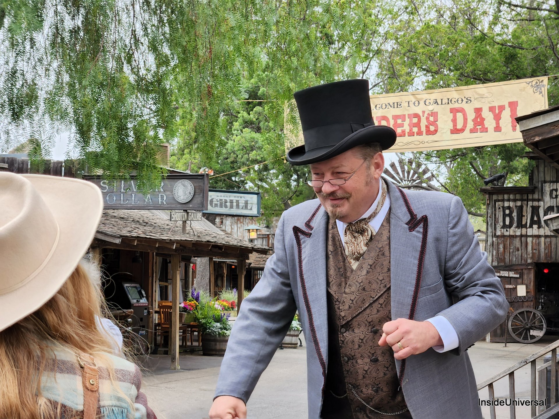 On days when the park opens at 10AM, the same time as Ghost Town Alive proper, it’s a big crowd that usually begins dispersing into rides about 9:50AM. But the select few know to wait for the ribbon cutting ceremony for Calico’s Founder’s Day! With appropriately sized scissors, as Flint watches on!