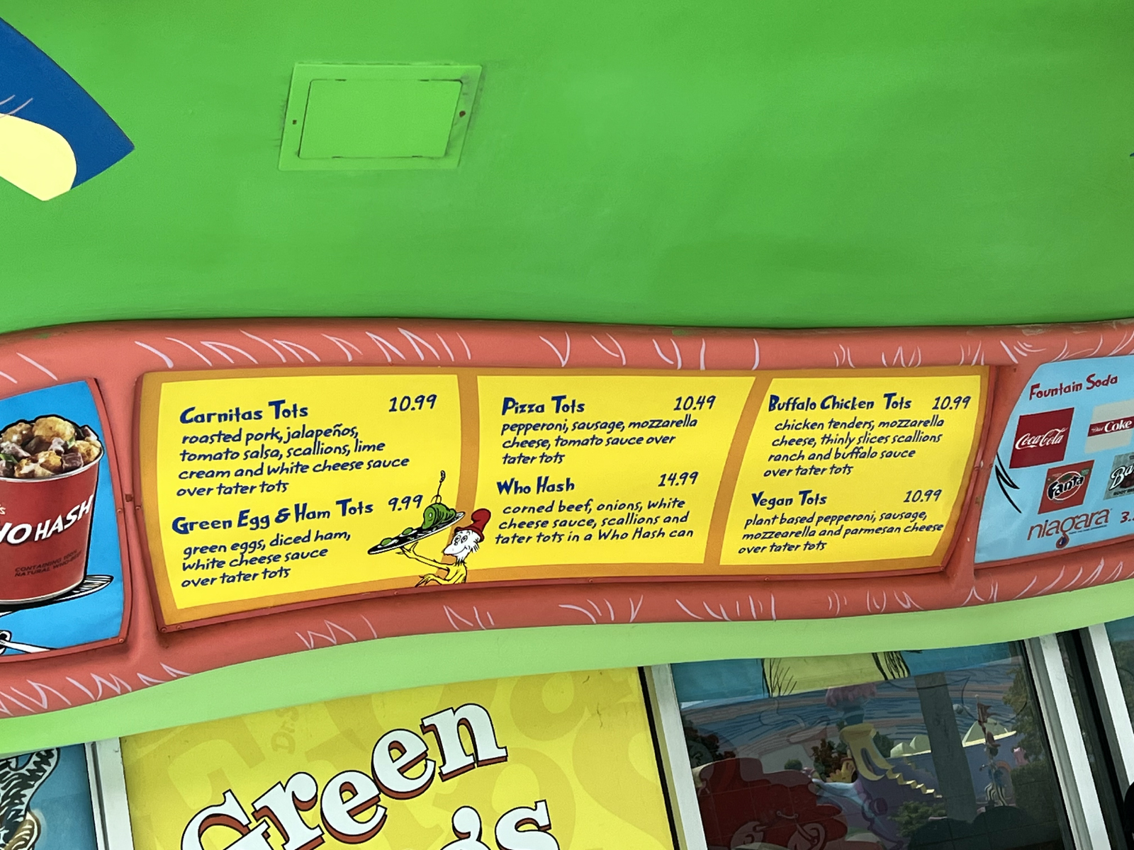 Philly Brisket is out; Carnitas are in! Universal Orlando has tweaked the menu at Green Eggs and Ham Cafe inside Seuss Landing, adding 2 new items while dropping the Philly Brisket Tot plate.