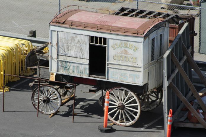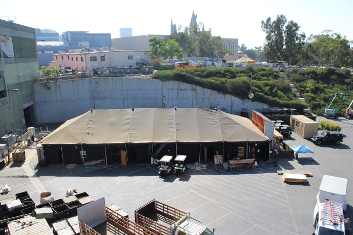 The second tent on the Curious George Lot now has walls and is putting together its front facade. In addition, there are wooden fences surrounding both maze entrances and a few set pieces can be seen scattered through the lot. A truck labeled “Smyth’s Piano Service” is placed at the entrance of one maze and there is also a wagon put off to the side.