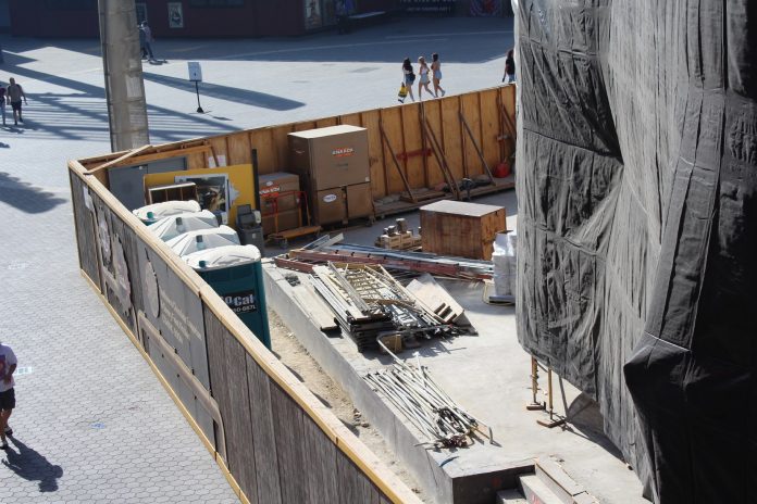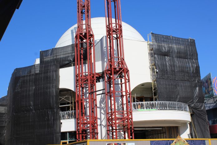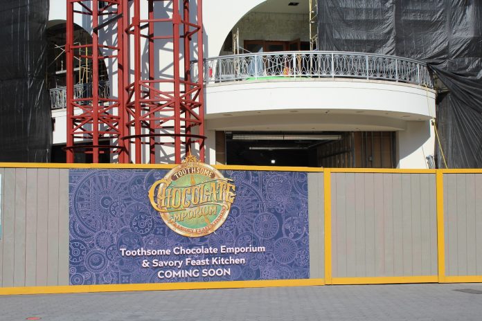 The Toothsome Chocolate Emporium & Savory Feast Kitchen construction site has made some steady progress. We can now see scaffolding along the exterior with what appears to be black polyethylene sheets covering numerous parts of the building. We can also see two red towers which seem to resemble chimneys. There is still no announcement for an official opening date, but the Universal Studios Box Office located on CityWalk which allows guests to make dining reservations recently placed a sticker of the restaurant’s logo with the words “coming soon” written across.