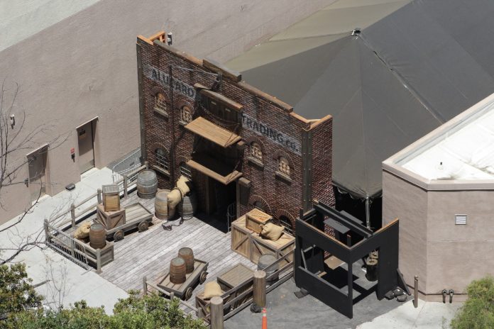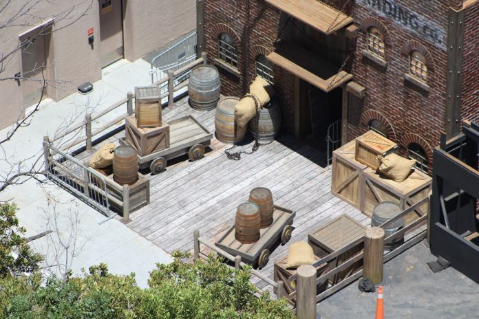 The front facade and exterior of the maze located next to the Revenge of the Mummy queue are decorated with a variety of wooden boxes and barrels. We can clearly see the words, “Alucard Trading Co.” along the top with some chain detailing.