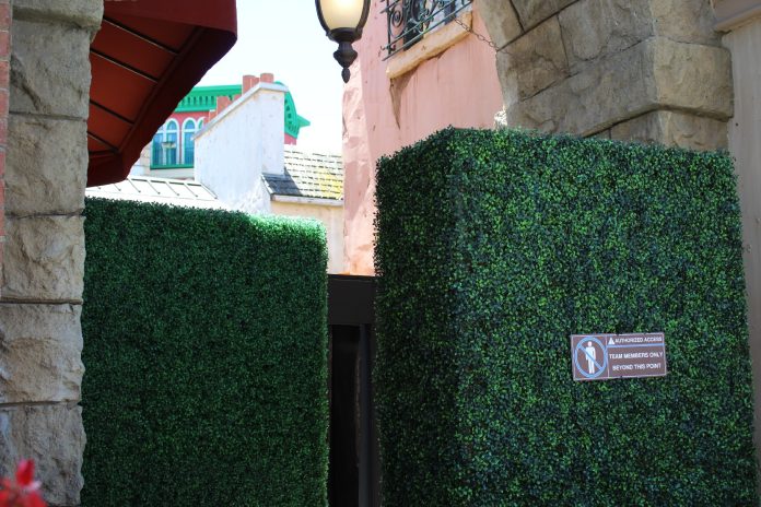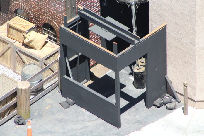 The front facade of the maze running through the Parisian Courtyard now has three bells adorning the top with rustic bricks surrounding its frame. We can also see that black walls have now been put up within the inside of the courtyard for the maze.