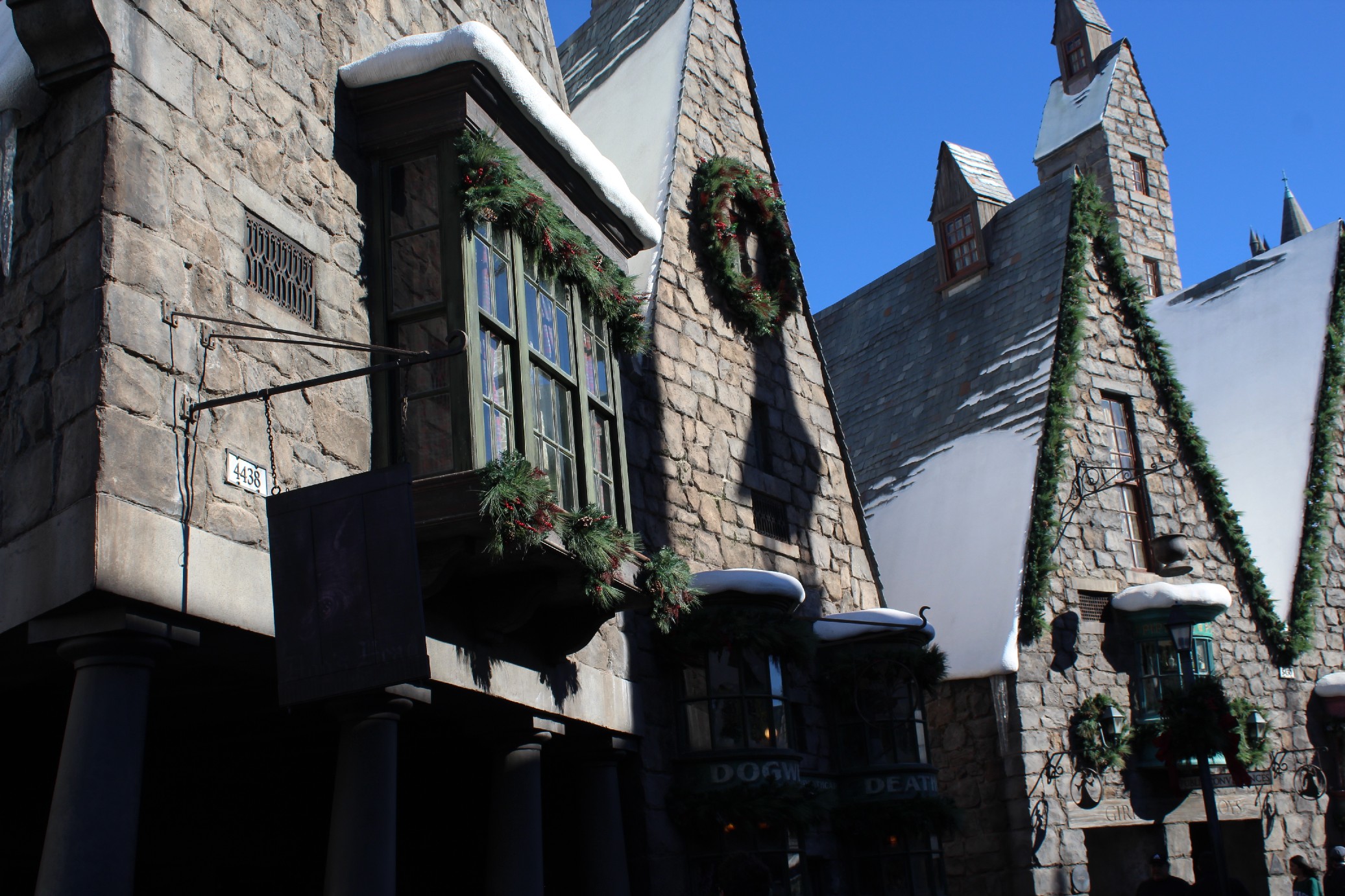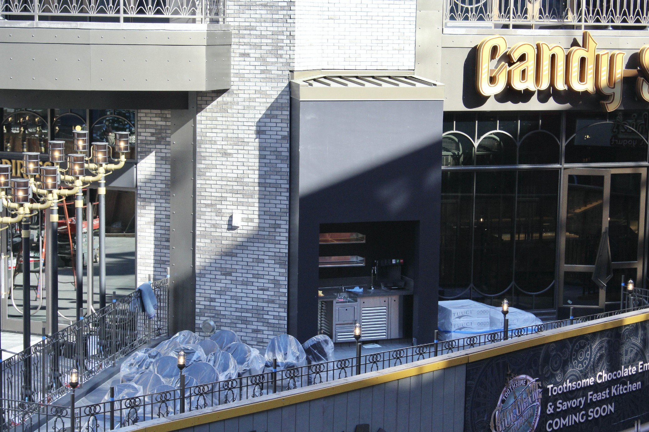 The signage for the Toothsome Chocolate Emporium & Savory Feast Kitchen has finally been installed! The gears on the signage spin and we can also see a sign that says “Food and Spirits” along with one that says “Candy Smith.” It’s truly exciting to see all the details on the exterior coming together as well.