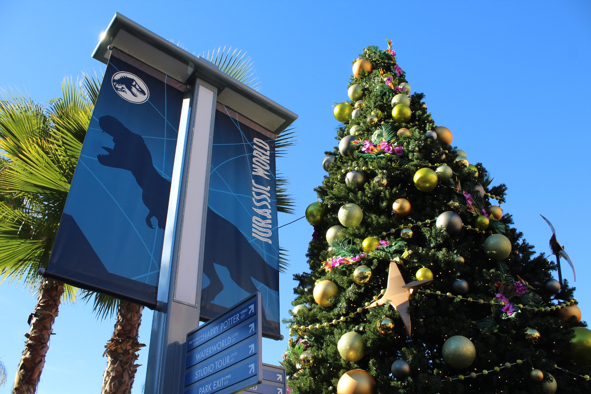 There is so much festive spirit as the park is gearing up for the Holidays. We can see garlands with colorful baubles, wreaths, poinsettias, and creatively decorated Christmas trees! The Christmas tree located in the Jurassic World area decorated with pterodactyls is back in the Lower Lot next to Isla Nu-Bar. We even got a glimpse of the tree inside the Universal Plaza as they prepare for the Grinchmas celebration.
