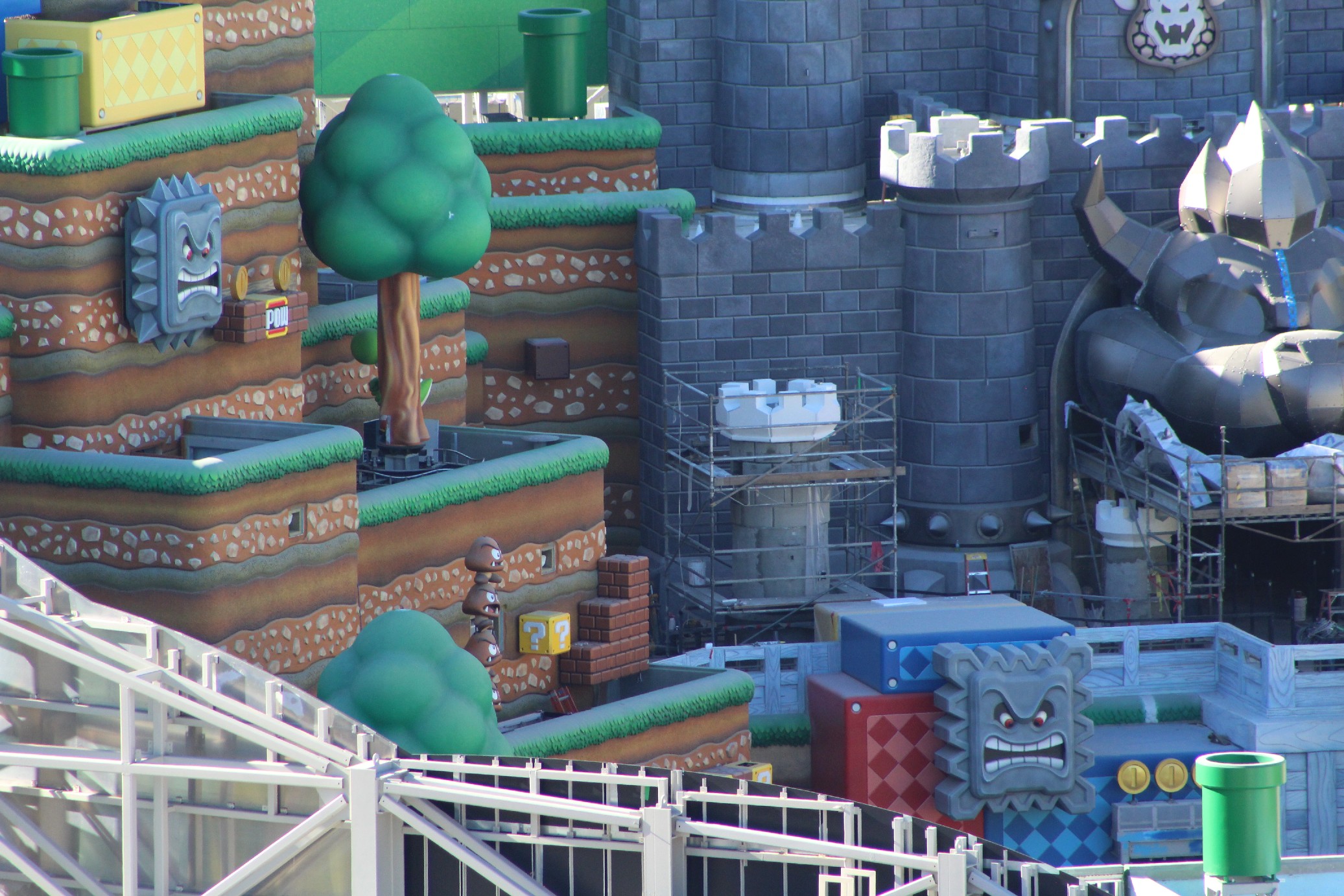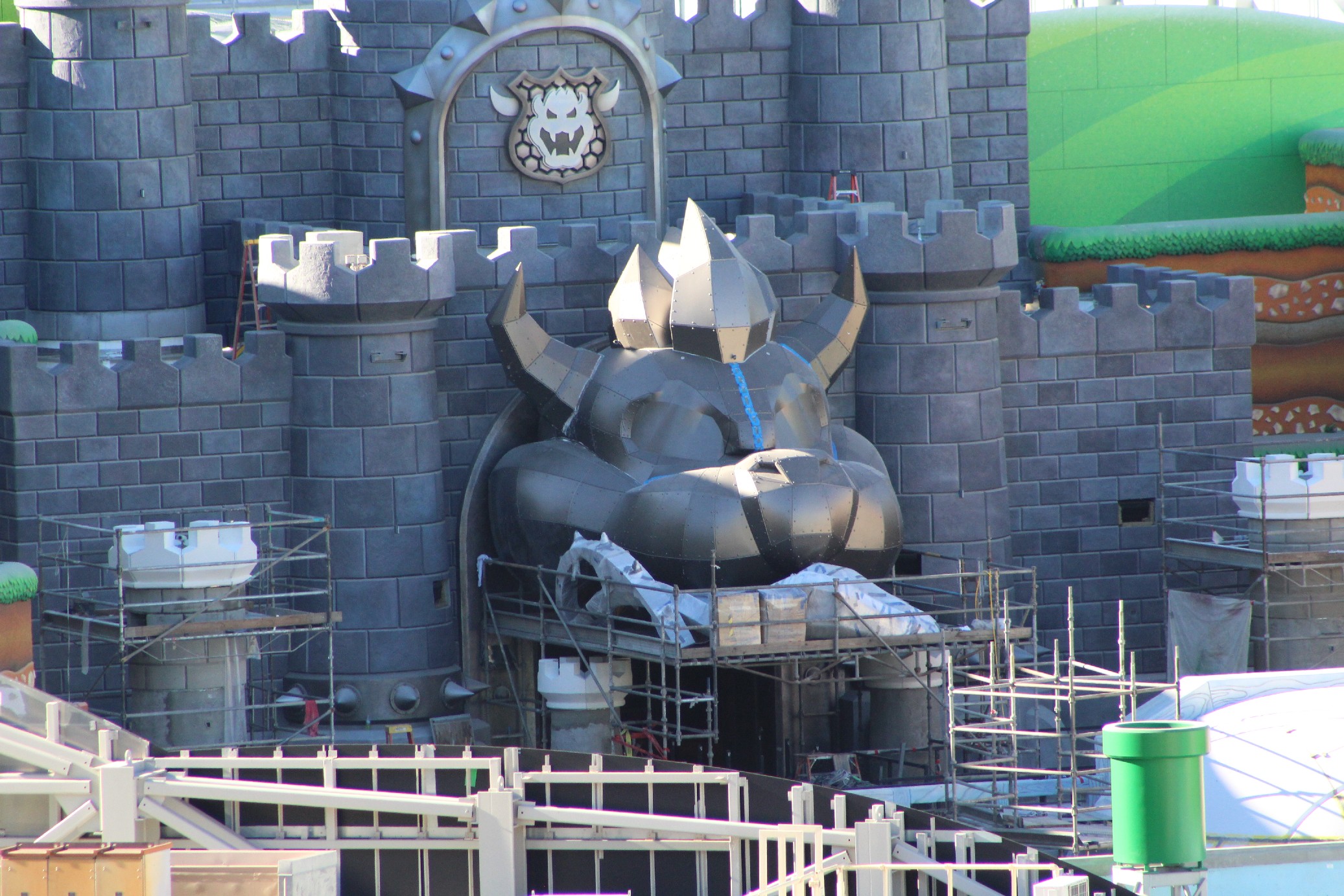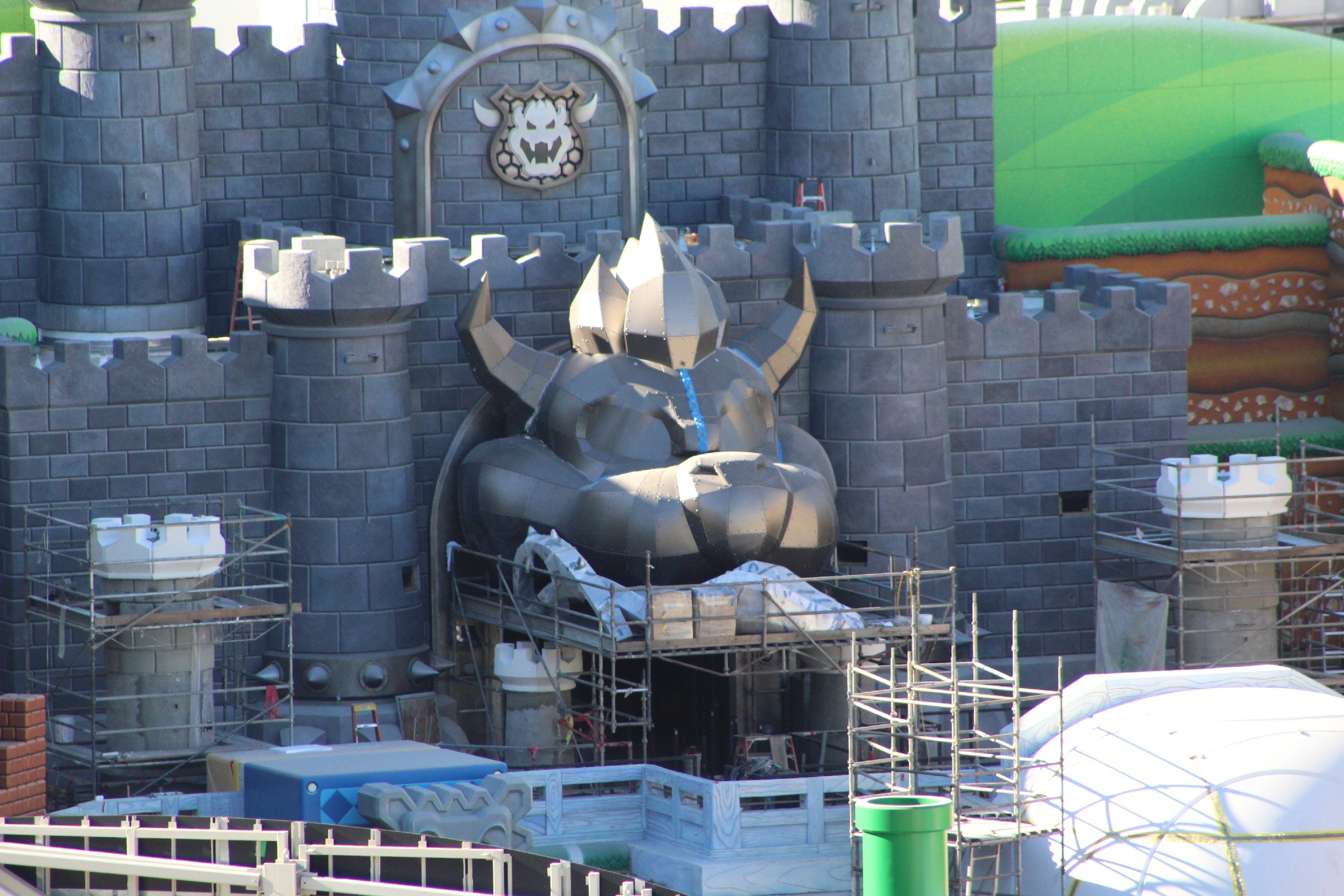 Bowser’s head can now be seen at the front of the castle and more detail in the surrounding area is being completed. Scaffolding has also been placed around the dome in front of the castle and additional decorations such as coin blocks have been put up as well.