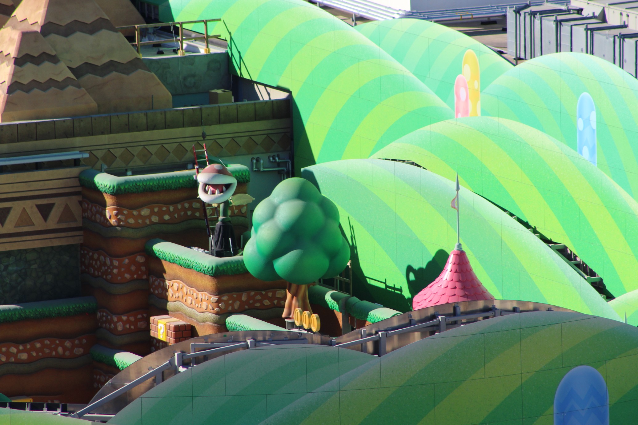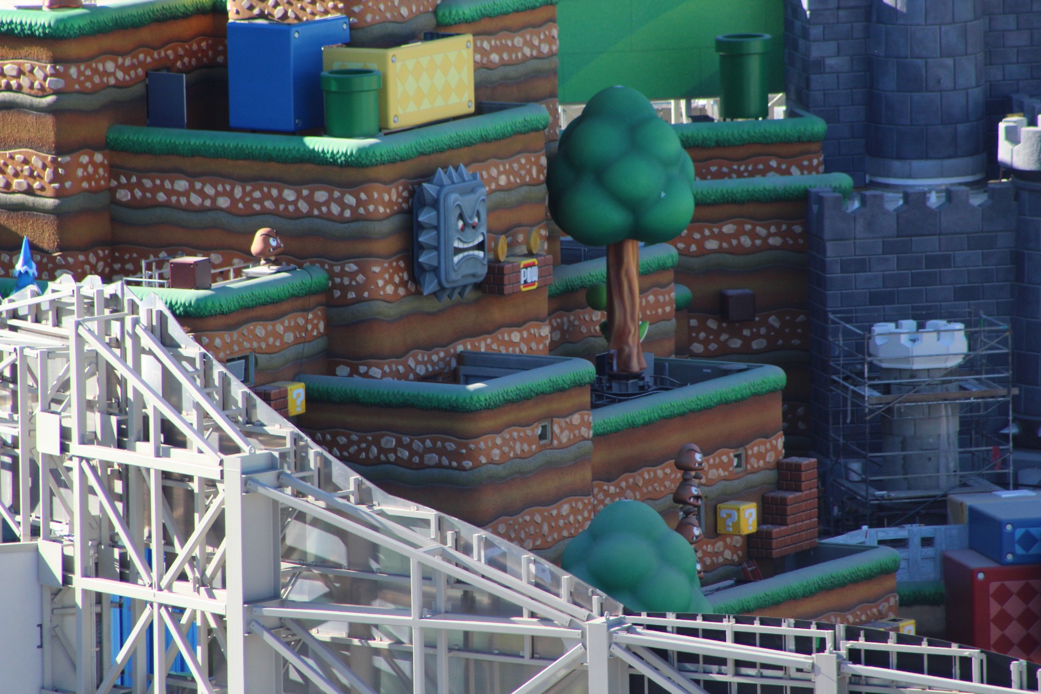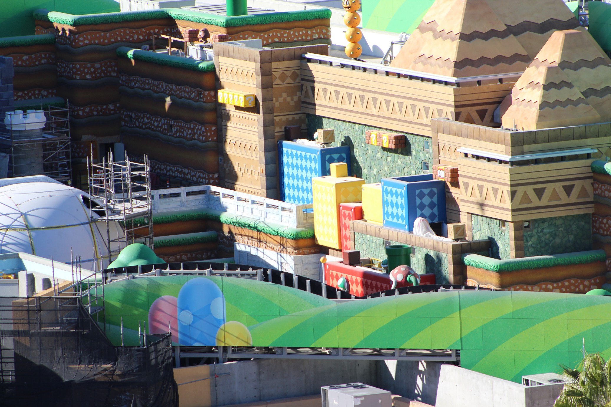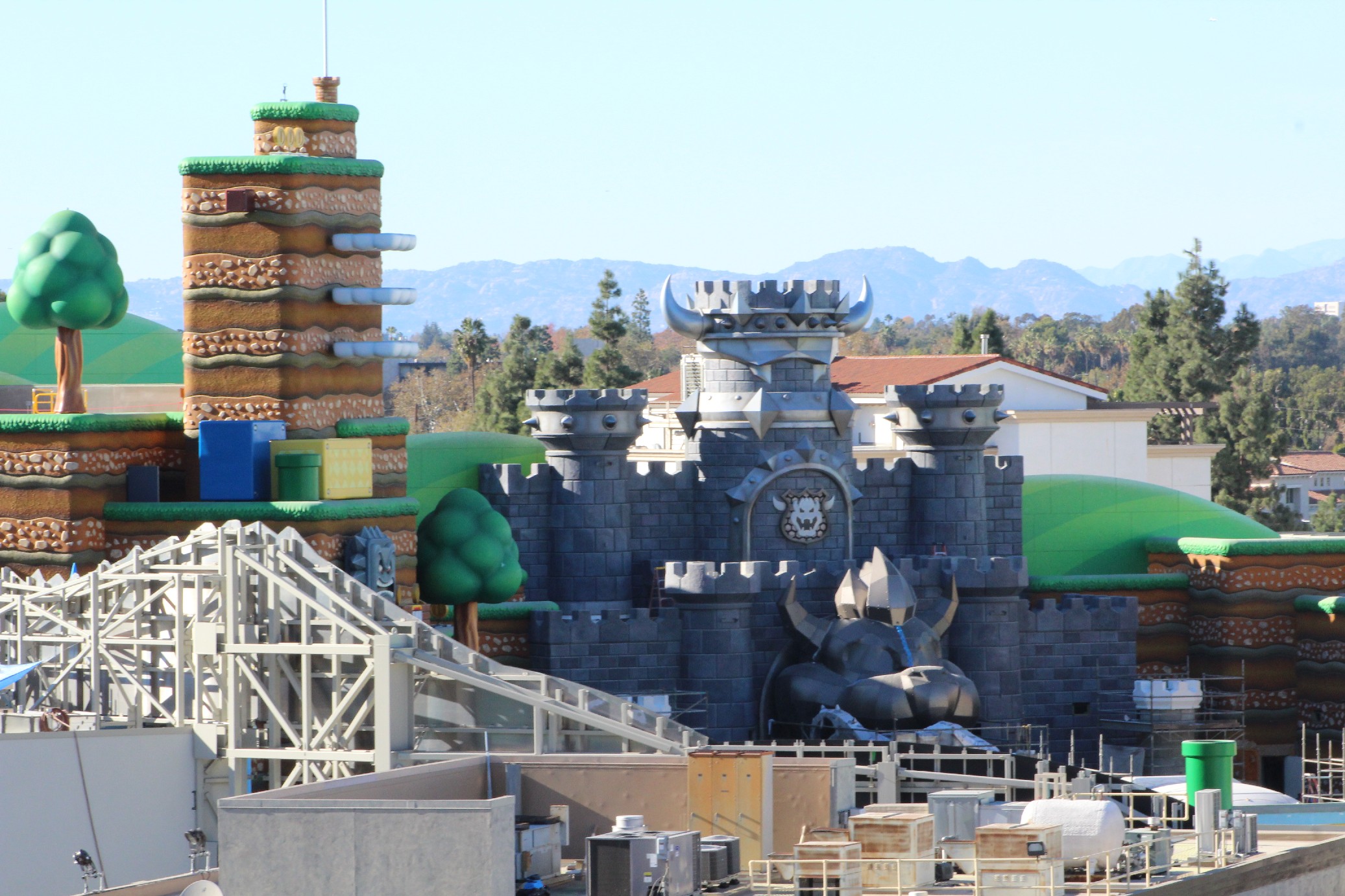Bowser’s head can now be seen at the front of the castle and more detail in the surrounding area is being completed. Scaffolding has also been placed around the dome in front of the castle and additional decorations such as coin blocks have been put up as well.