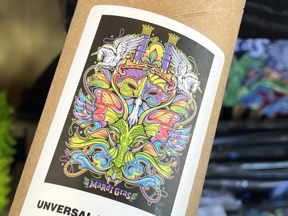 Lastly, a general Universal Mardi Gras design includes familiar iconography from the event, including shrimp, King Gator, and the iconic Universal archway.