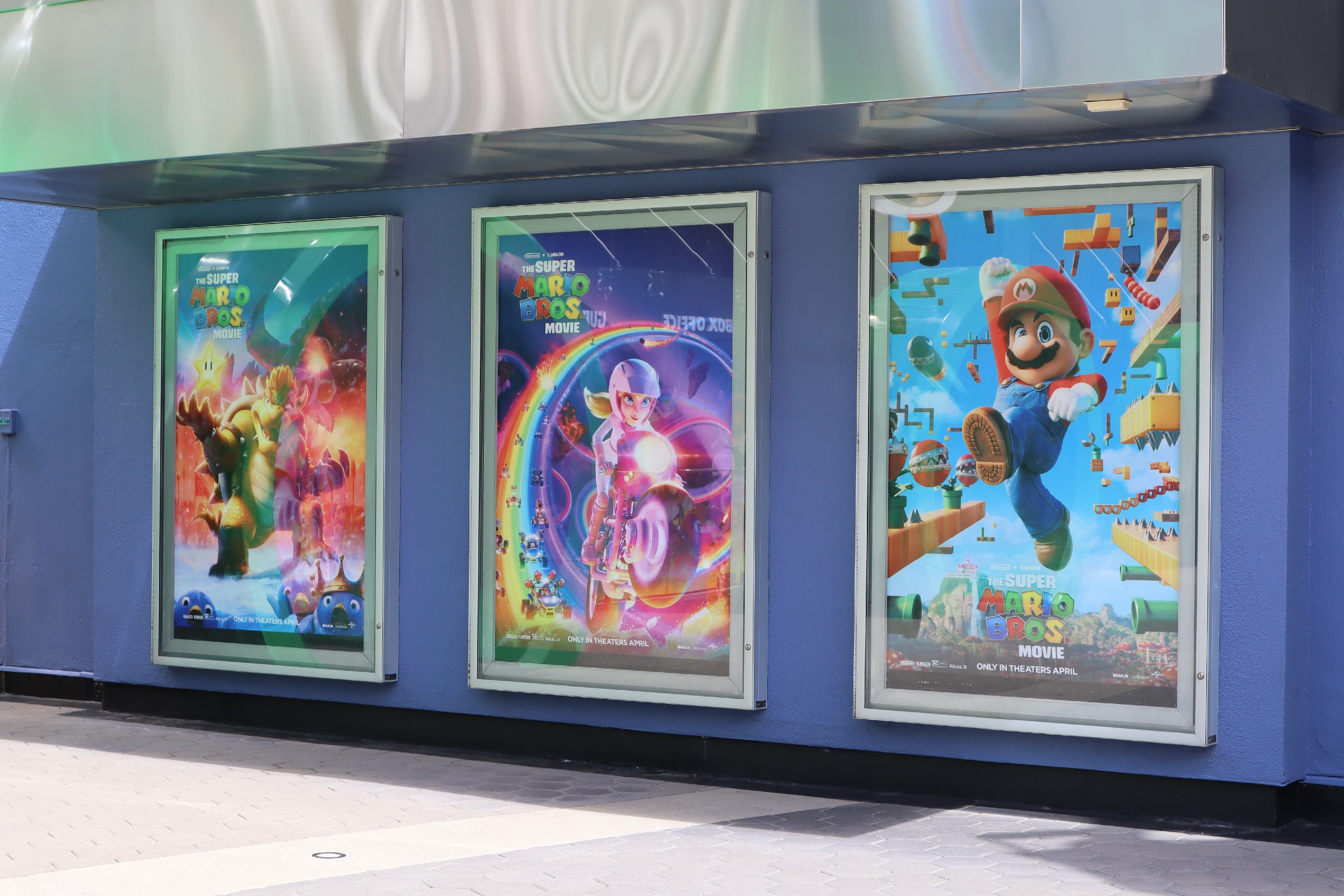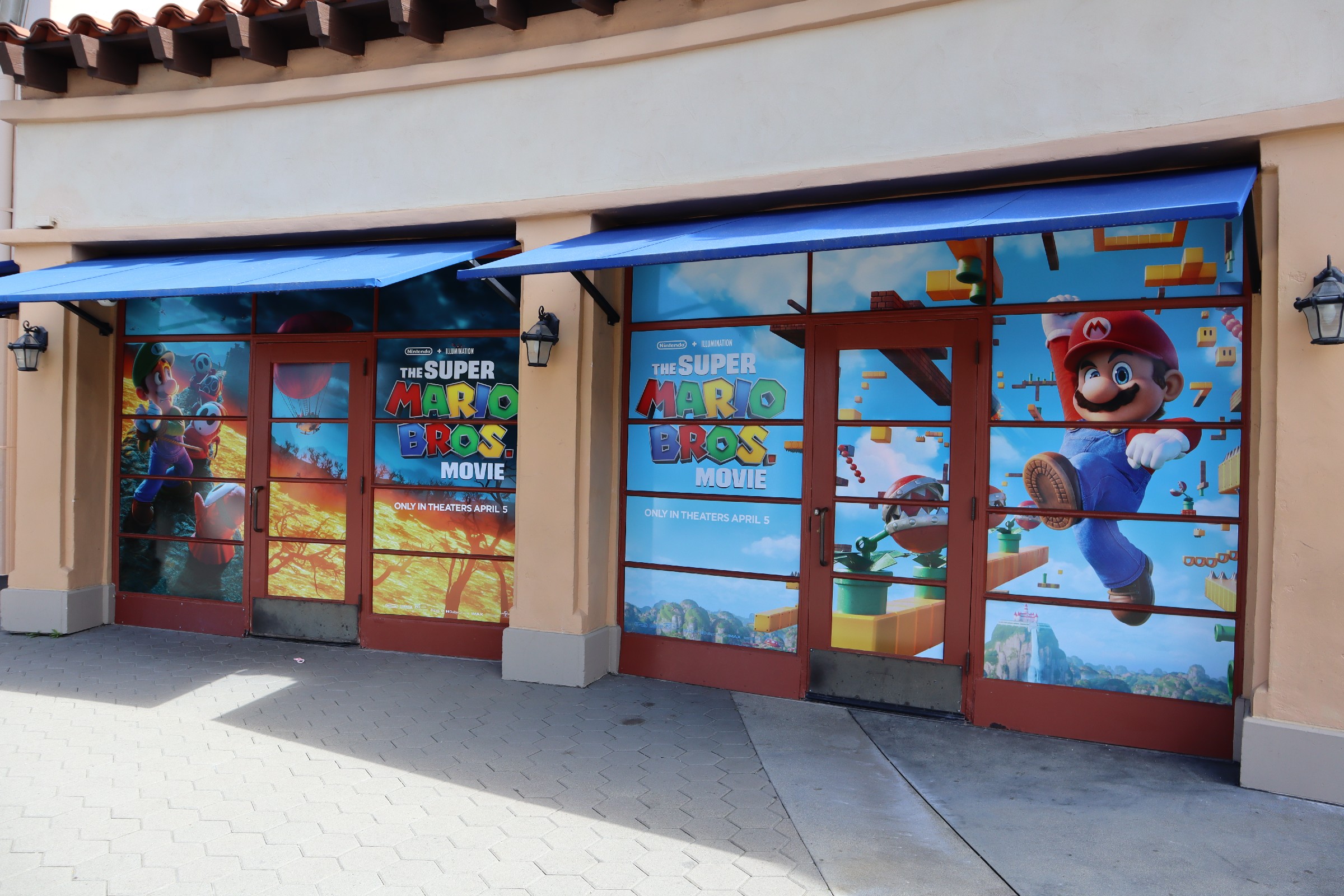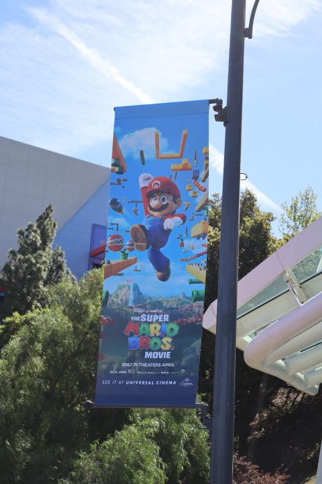 Upon exiting the park, posters promoting the release of The Super Mario Bros. Movie can be seen.