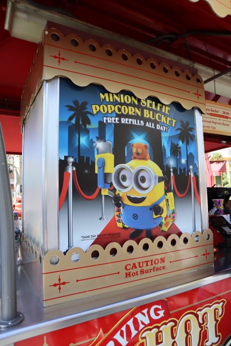 A new collectible Minion Selfie Popcorn Bucket is available for purchase all throughout the park. Free popcorn refills are available on the day of purchase.