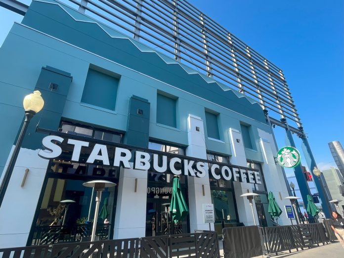 Scrims and work walls are down at the old Starbucks location revealing a sleek, modern facade for the coffee shop. The temporary location has shuttered in anticipation of the original location’s reopening.