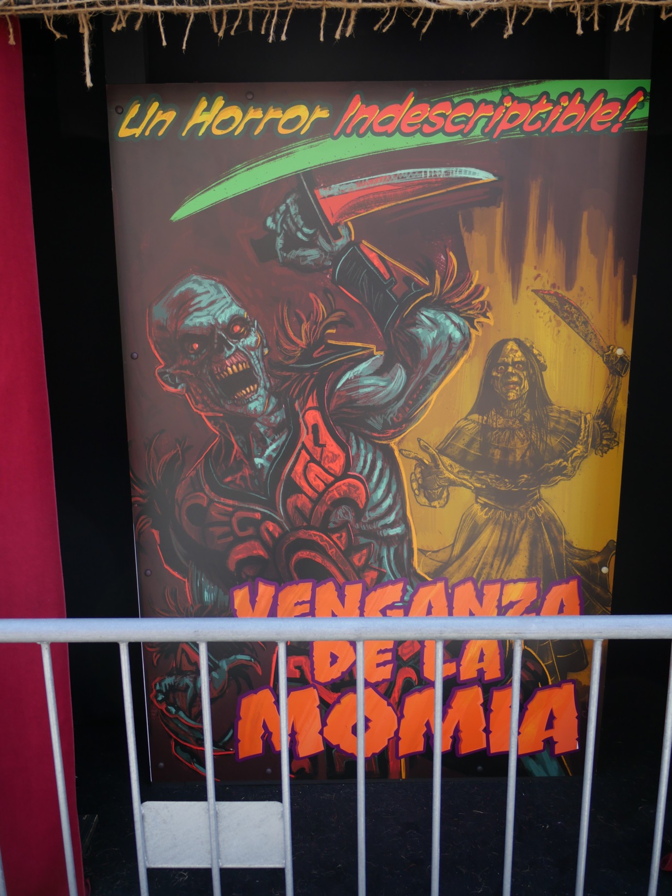 El Terror De Las Momias is this year’s scarezone for French Street, tying into the Latin American theme of the nearby Monstruos maze. Giant skeletal figures loom high above the zone and various stages have been erected along the street.