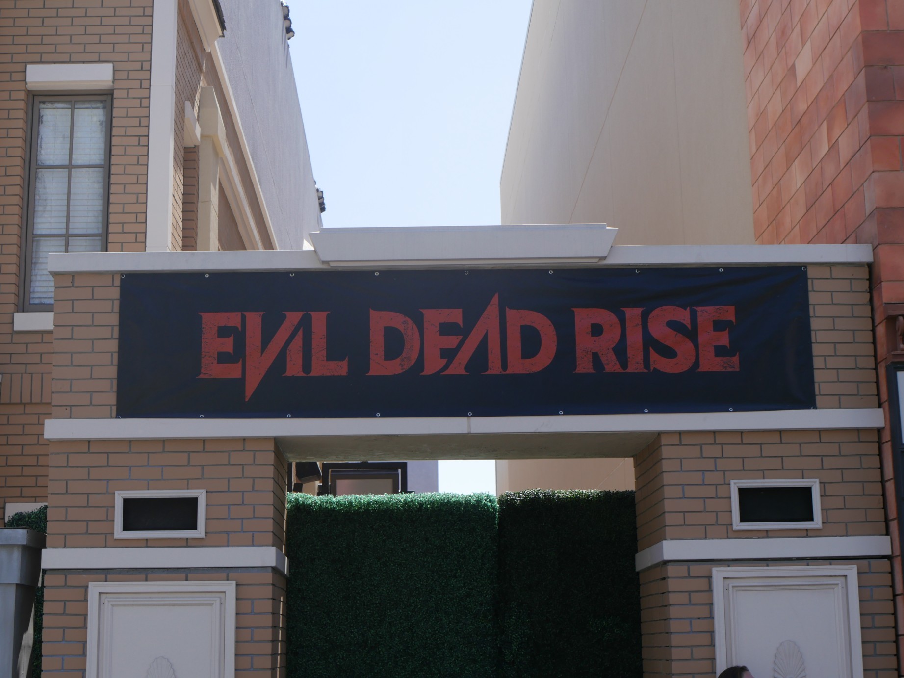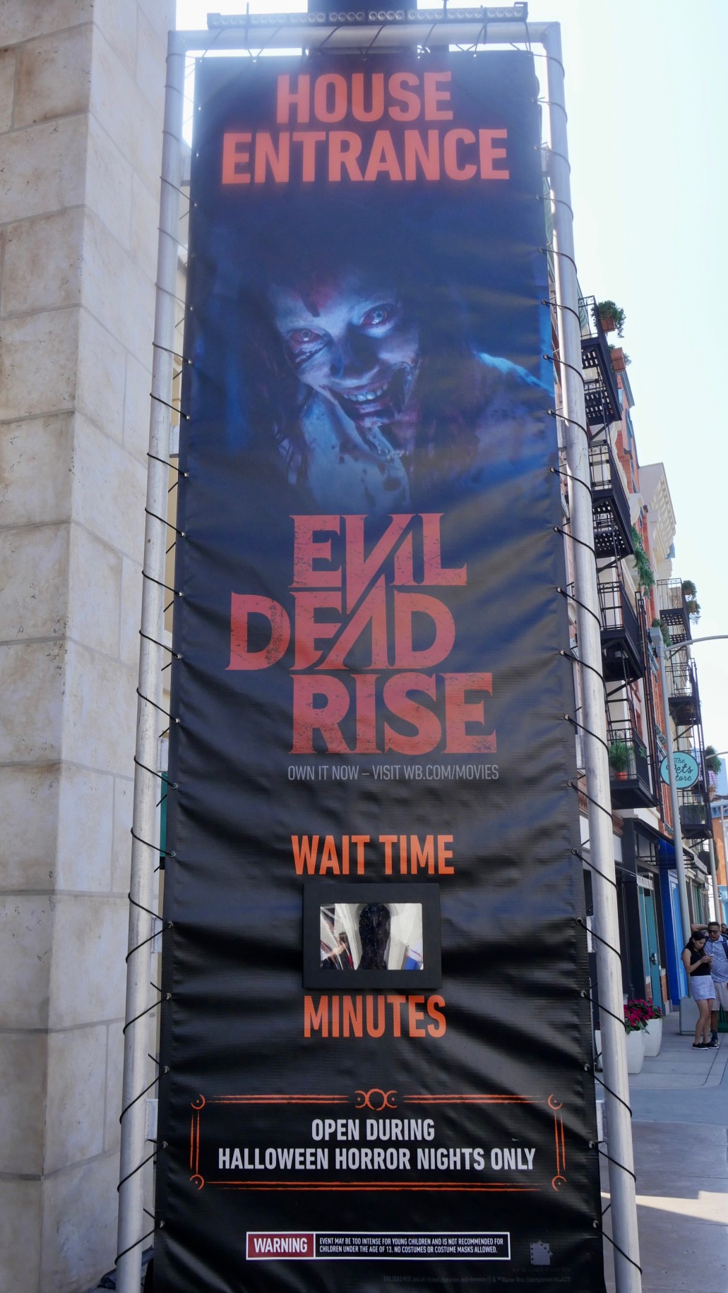 Evil Dead Rise’s banner has been installed at the Hudson Gate location.