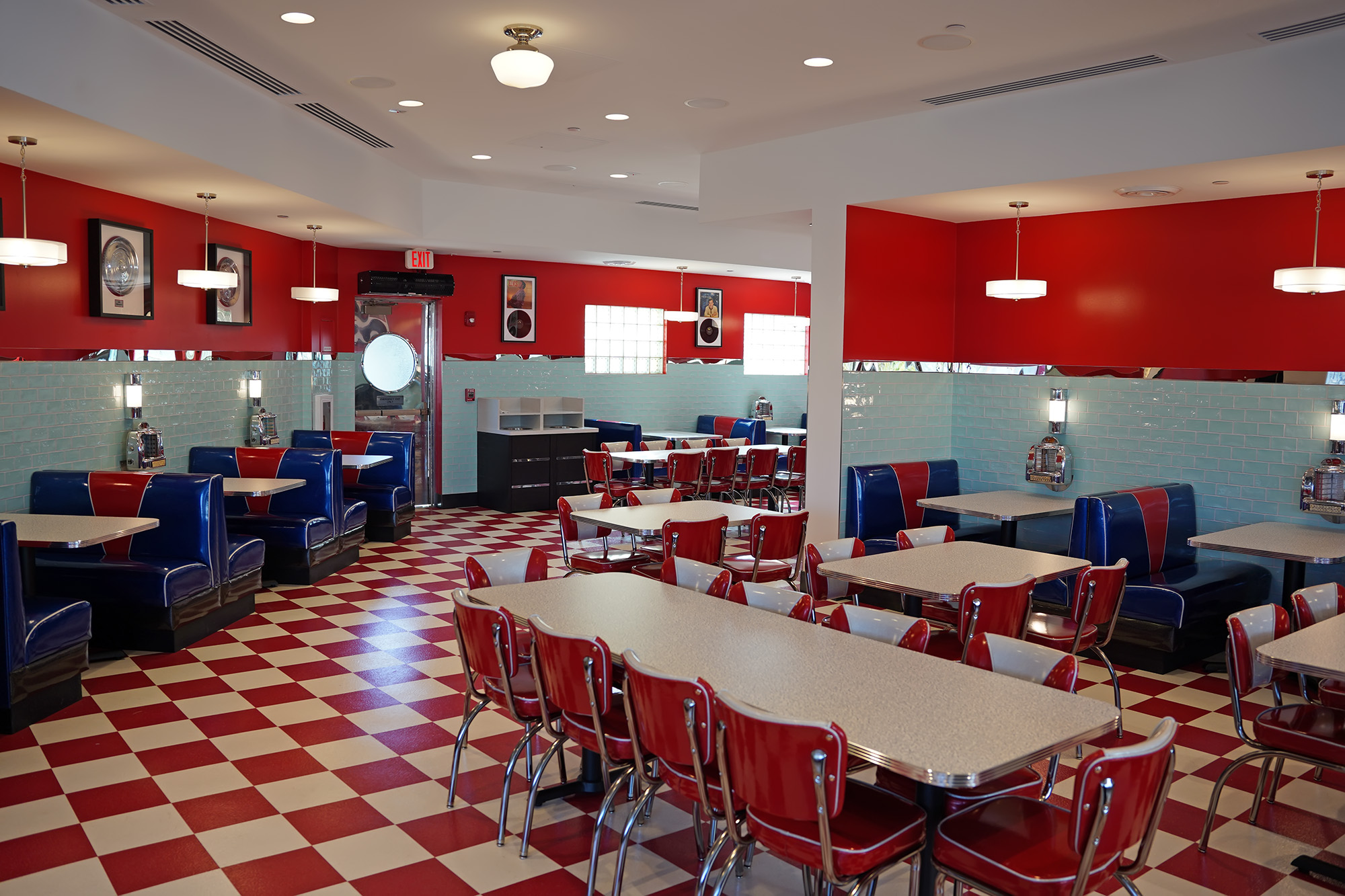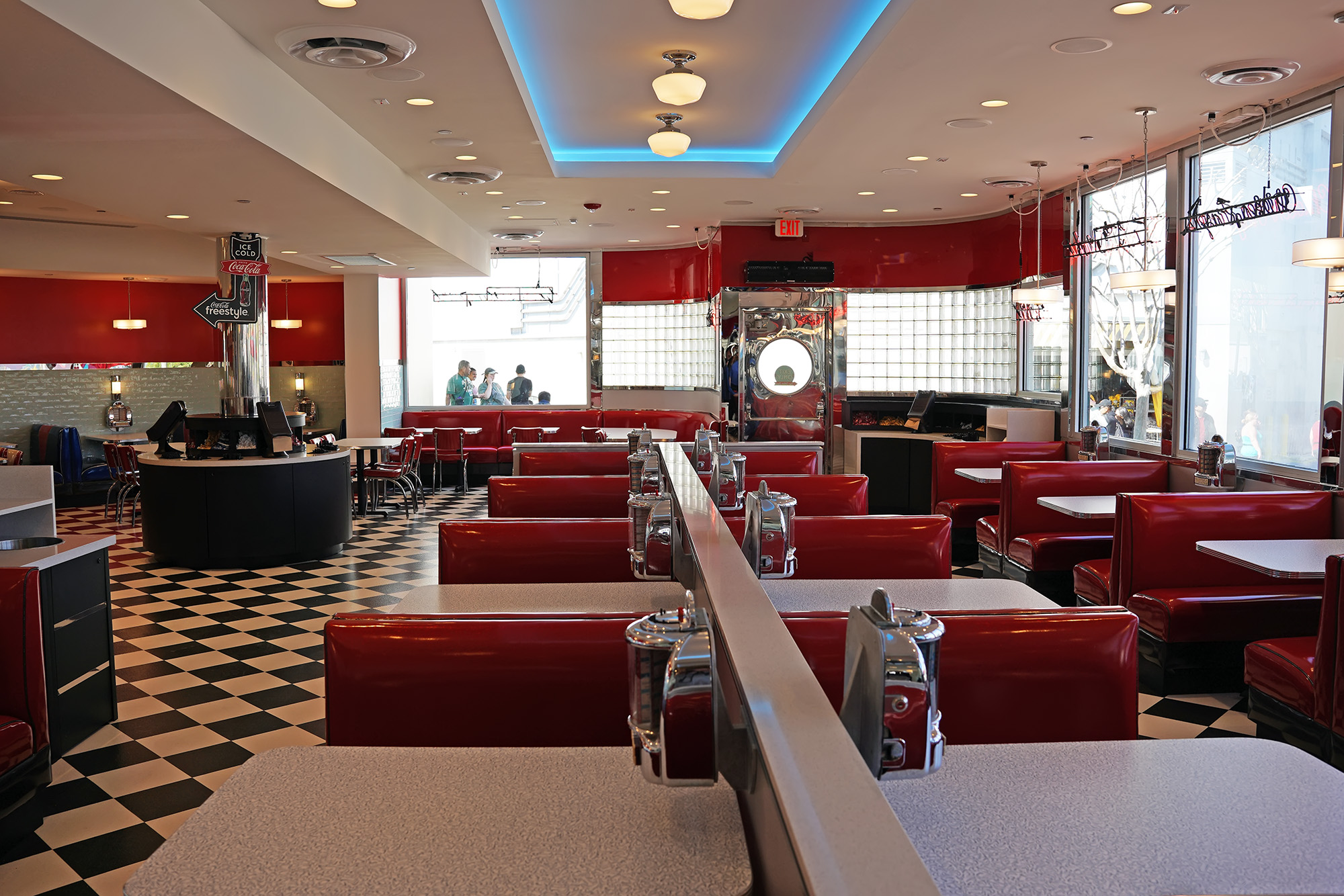 The restaurant saw a complete overhaul during its renovation – with new floors, new booths, new decor, and new uniforms for team members. The color palette is fitting for a 50s-era theme – reds and blacks with blue serving as an accent color; with the table tops featuring an atomic boomerang pattern. The Coca-Cola Freestyle Machines also are era-appropriate, as they sport a vintage look like the old vending machines from that time.