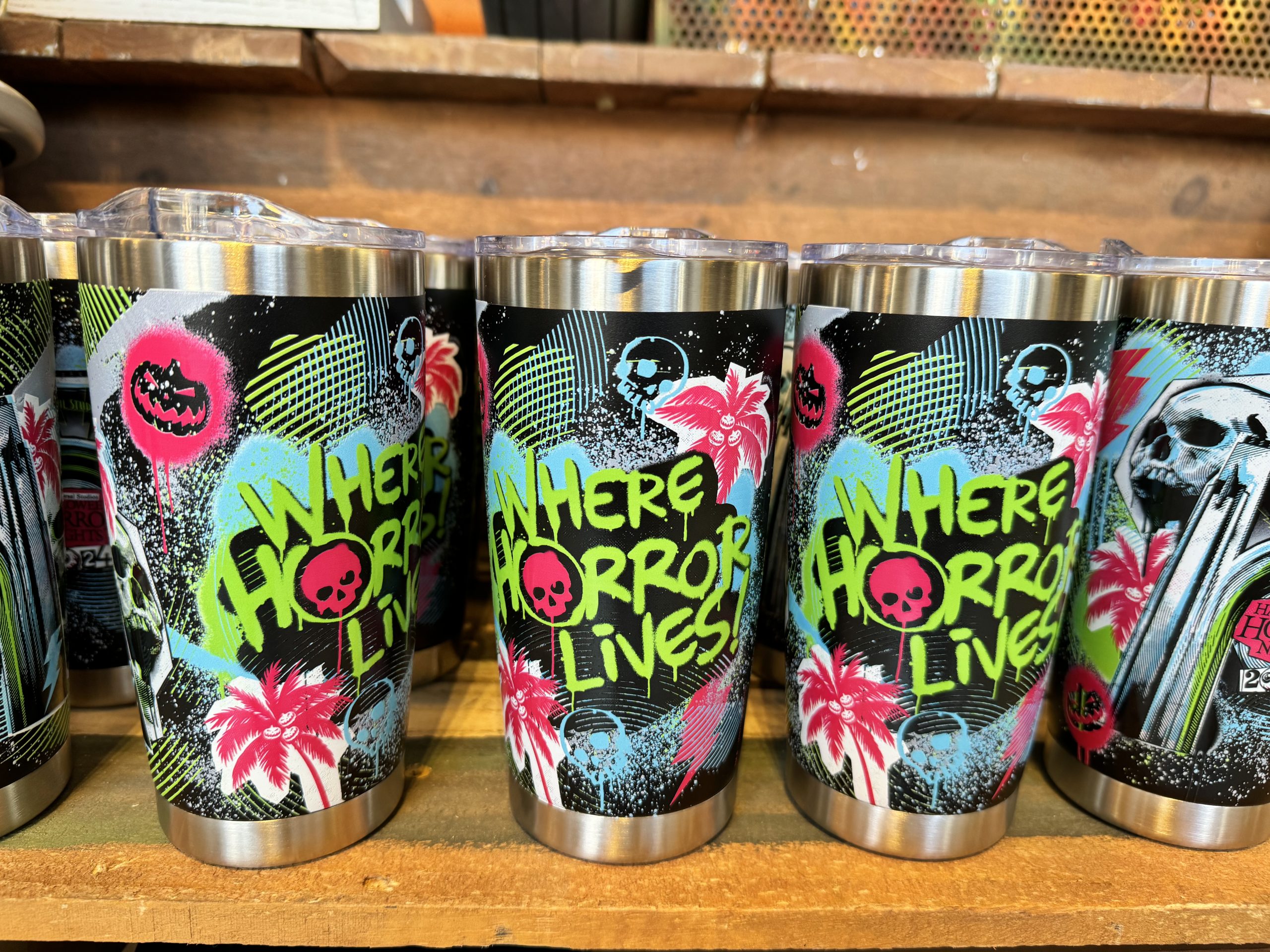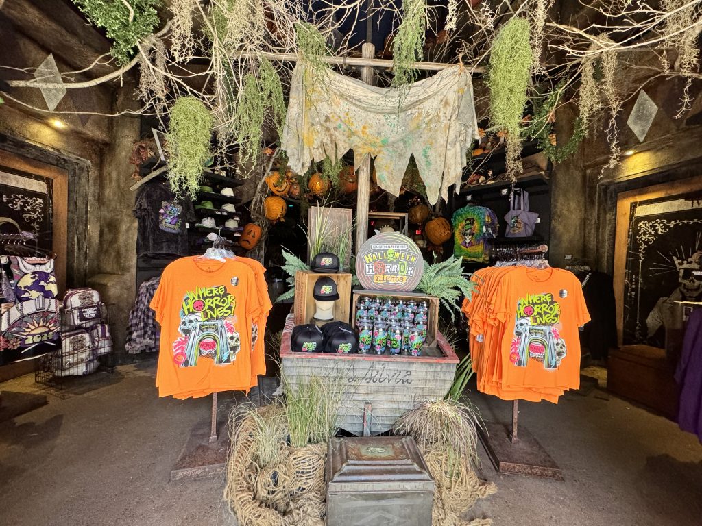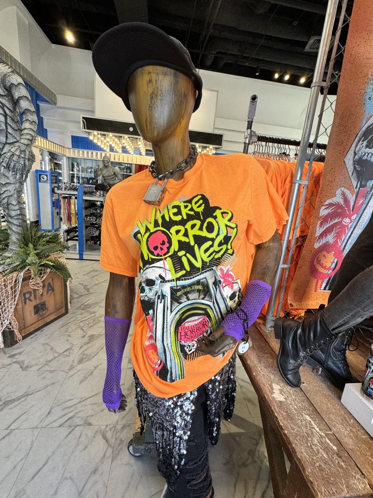 Featuring the tagline, “Where Horror Lives”, the new punk-inspired merch line features bright oranges, greens, and pinks. Guests can purchase a t-shirt ($33), a hat ($30), or a tumbler cup ($27).