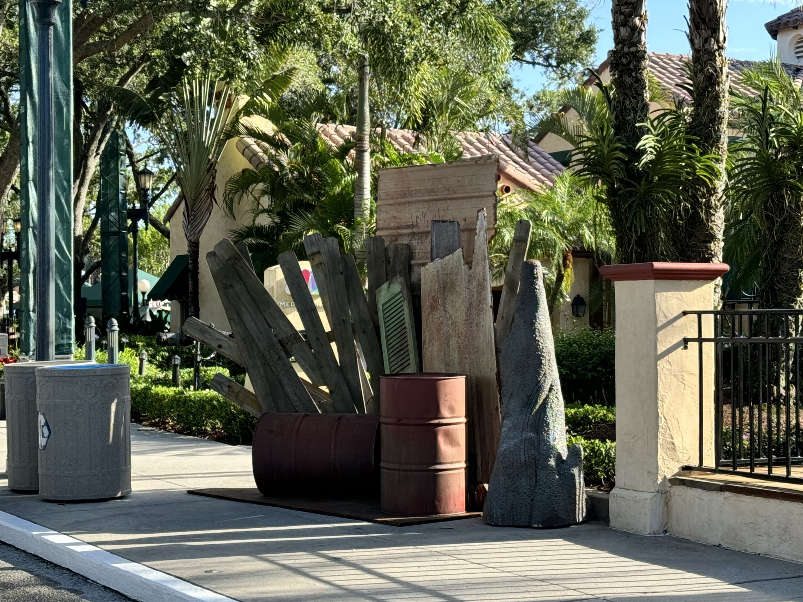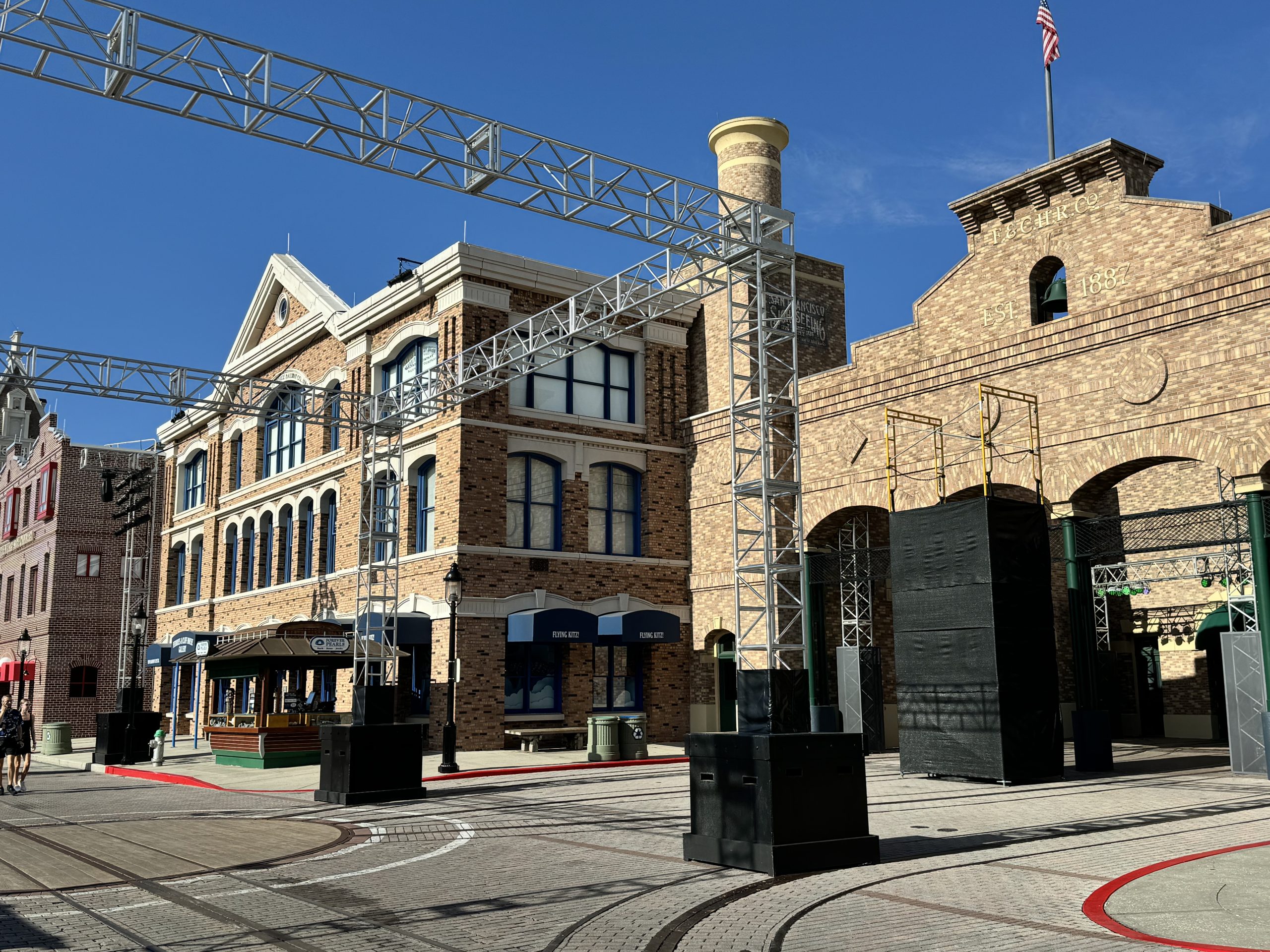 Scare zone setup is underway at Universal Studios Florida as the park gets ready for Halloween Horror Nights 33 as the first “themed” elements for a scare zone were installed in Central Park.